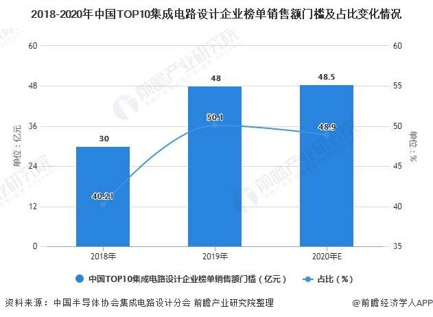 集成电路设计产业集中度逐步提高,扭转了之前“小、散、弱”的局面。2019年三家最大通信芯片企业的销售之和超过1000亿元,占通信芯片领域销售额的88.7%。进入2019年前十大设计企业榜单销售收入的门槛提高到48亿元,比2018年的30亿元,大幅提高了18亿元。