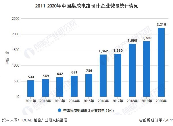 随着《国家集成电路产业发展推进纲要》发布和其他一系列鼓励政策的颁布,集成电路设计行业成为目前中国集成电路产业中竞争最为激烈的领域。自2015年来,各地政府采取各种优惠措施吸引国内成熟的设计企业在异地开设分支机构,根据统计,2020年国内的芯片设计企业达到了2218家,比2019年的1780家多了438家,数量增长了24.6%。